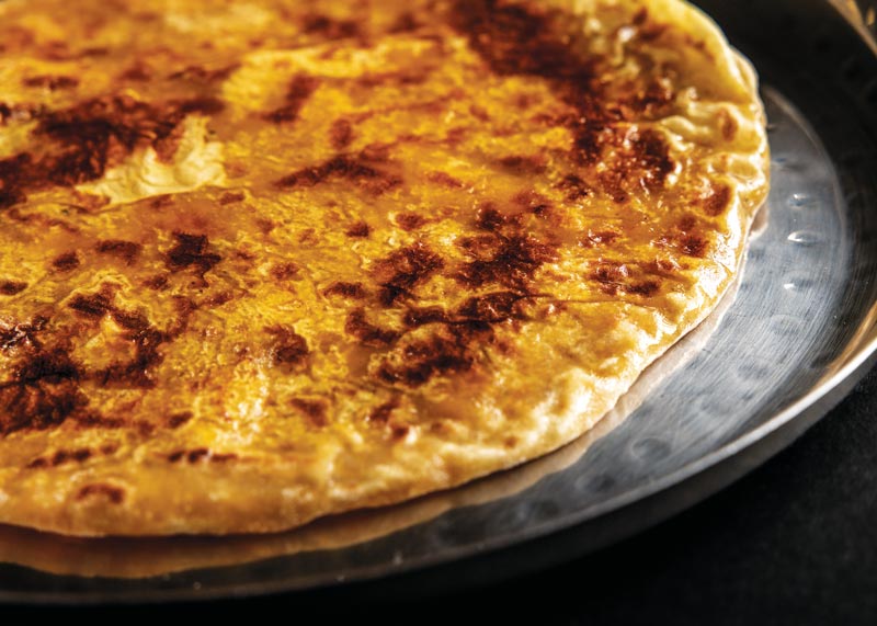 Puranpoli is made by soaking chana dal overnight, then boiling them until mashed. Jaggery, a natural sweetener from sugarcane, and ground cardamom are then added to the mashed lentils and cooked to a thick paste. The filling is rolled into balls, then stuffed into a flour-based dough and rolled into sweetened flatbreads. When she was first opening Puranpoli in 2020, Shivalkar’s mom came from India to guide her on the recipe and technique, bringing memories of past festival celebrations alive in the restaurant.